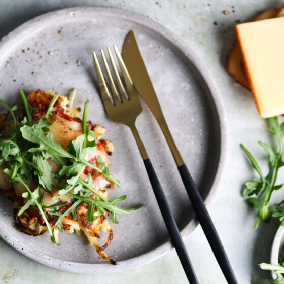Pizza kann auch ohne Teig. Hier mit Weisskohlboden und Raclette-Topping. Funktioniert prima. Und vielleicht ist es auch einbisschen eine Rösti.