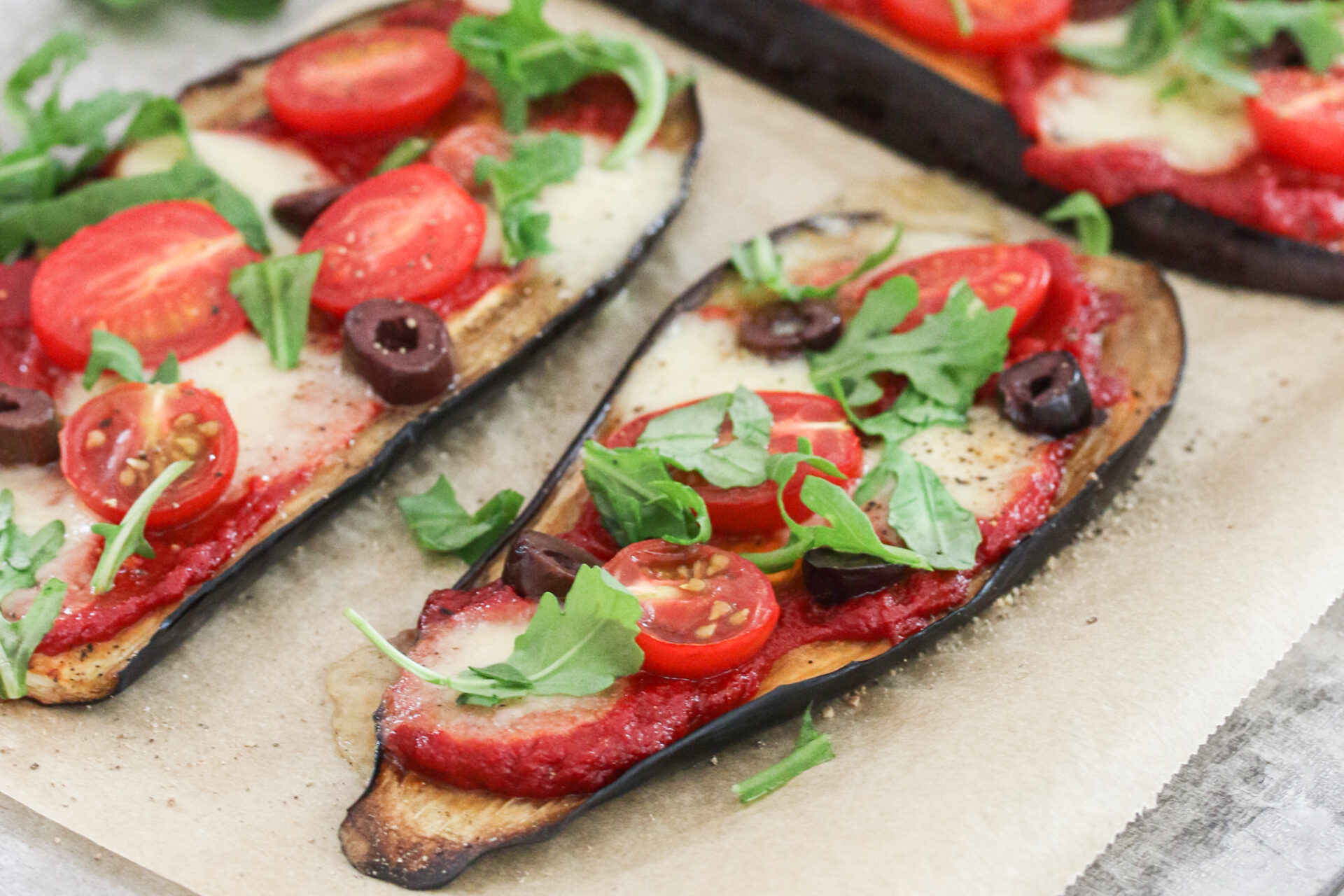 - Die Auberginenscheiben nach der Backzeit aus dem Ofen nehmen. Zuerst mit Tomatensauce bestreichen, dann mit Mozzarella, Cherry-Tomaten und den optionalen Zutaten belegen. Die Auberginen nochmals 12 Minuten fertig backen, mit grobem Pfeffer würzen und mit frischem Rucola oder Basilikum dekorieren.