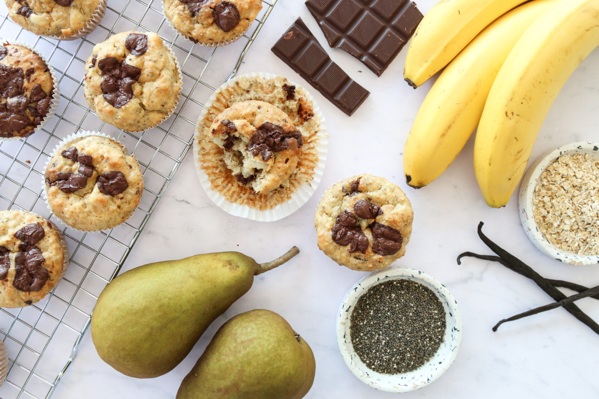 - In der ersten Schüssel Mehl, Backpulver und Salz in einer Schüssel vermengen. Birnen vierteln, schälen und in Würfel schneiden, darunter mischen. 80 g der Schokolade grob hacken und ebenfalls darunter mischen. Haferflocken unterrühren.