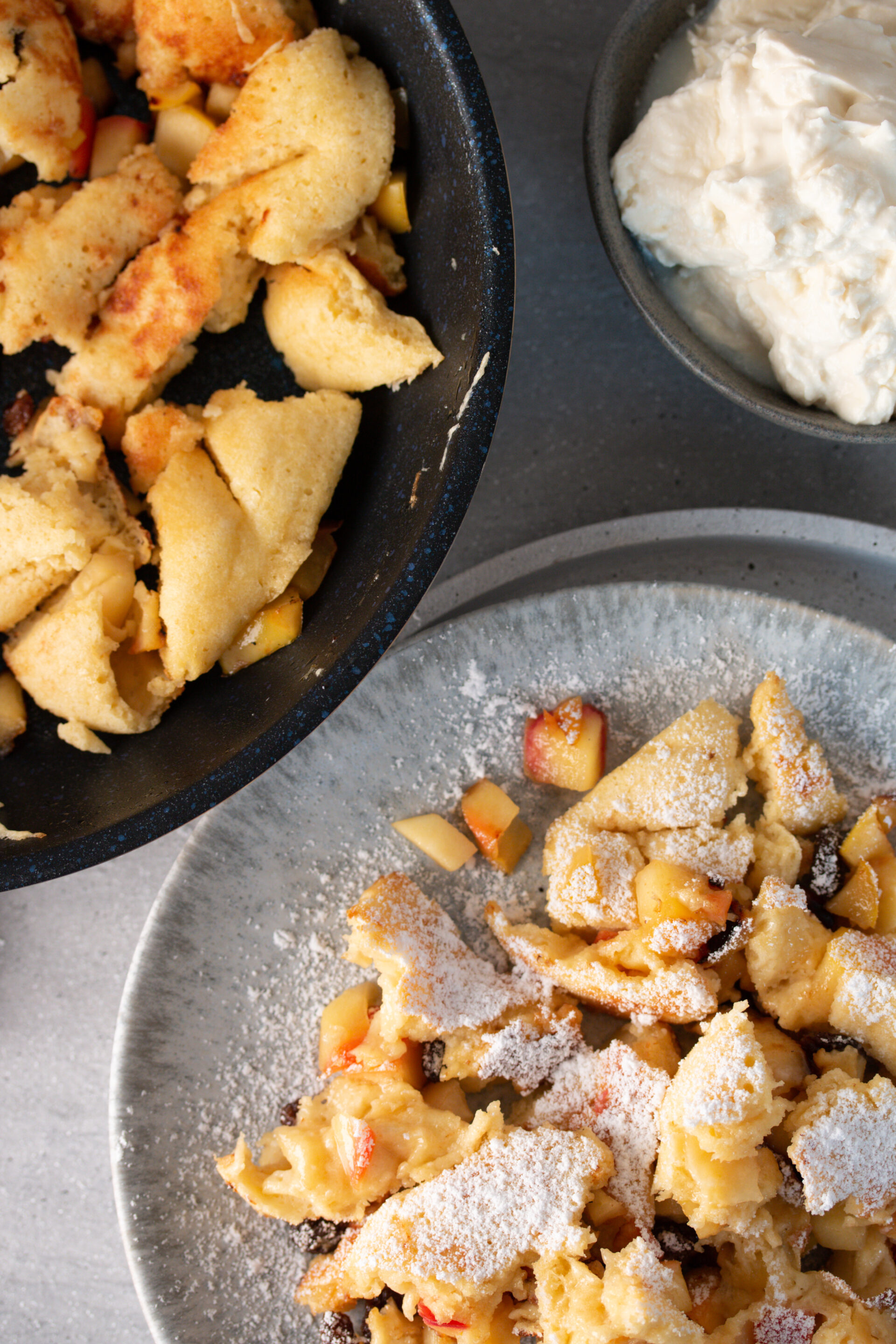Doch dieses Narrativ versuche ich hier sanft etwas umzuformen. SO EIN SCHMARRN GEHT IMMER, gell? Hier mit Bratapfel, aber das schmeckt auch toll mit Birnen oder auch in einer sommerlichen Variante mit Beeren oder gebratenen Pfirsichen. Oder OMG – PFIRSICHEN VOM GRILL! Alles geht, wenn man nur will.