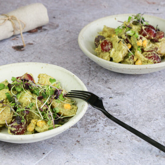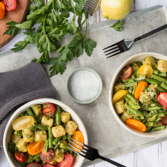 Schnell, unkompliziert, gesund und vegetarisch. Ein lauwarmer Gnocchi-Salat mit knackigen grünen Bohnen und einem frischen, leichten Petersilien-Zitronen-Pesto.