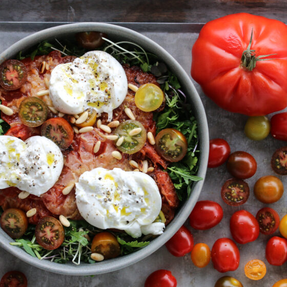 Ein schicker Salat, der Freude nicht. Nicht nur wegen der Burrata, die ohnehin immer ein freudiges i-Tüpfelchen ist. Sondern einfach weil alles zusammen herrlich schmeckt.