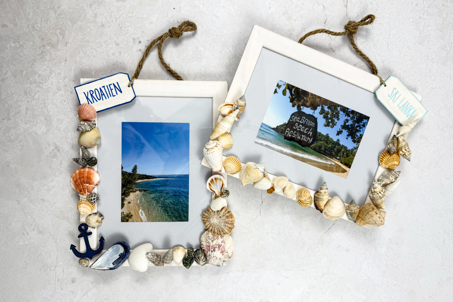 Damit die Ferienerinnerungen einen wohlverdienten Platz bekommen, gestalten wir heute dekorative Bilderrahmen. Verziert mit Muscheln (ob selbst am Strand gesammelt* oder gekauft) wird jedes Foto zu einem kleinen Kunstwerk, das Urlaubsfeeling in die eigenen vier Wände bringt. Und mit der individuellen Beschriftung wissen auch Auswärtige sofort, wo diese besonderen Momente entstanden sind. Damit könnte man gar eine Wall of Holidays schaffen.