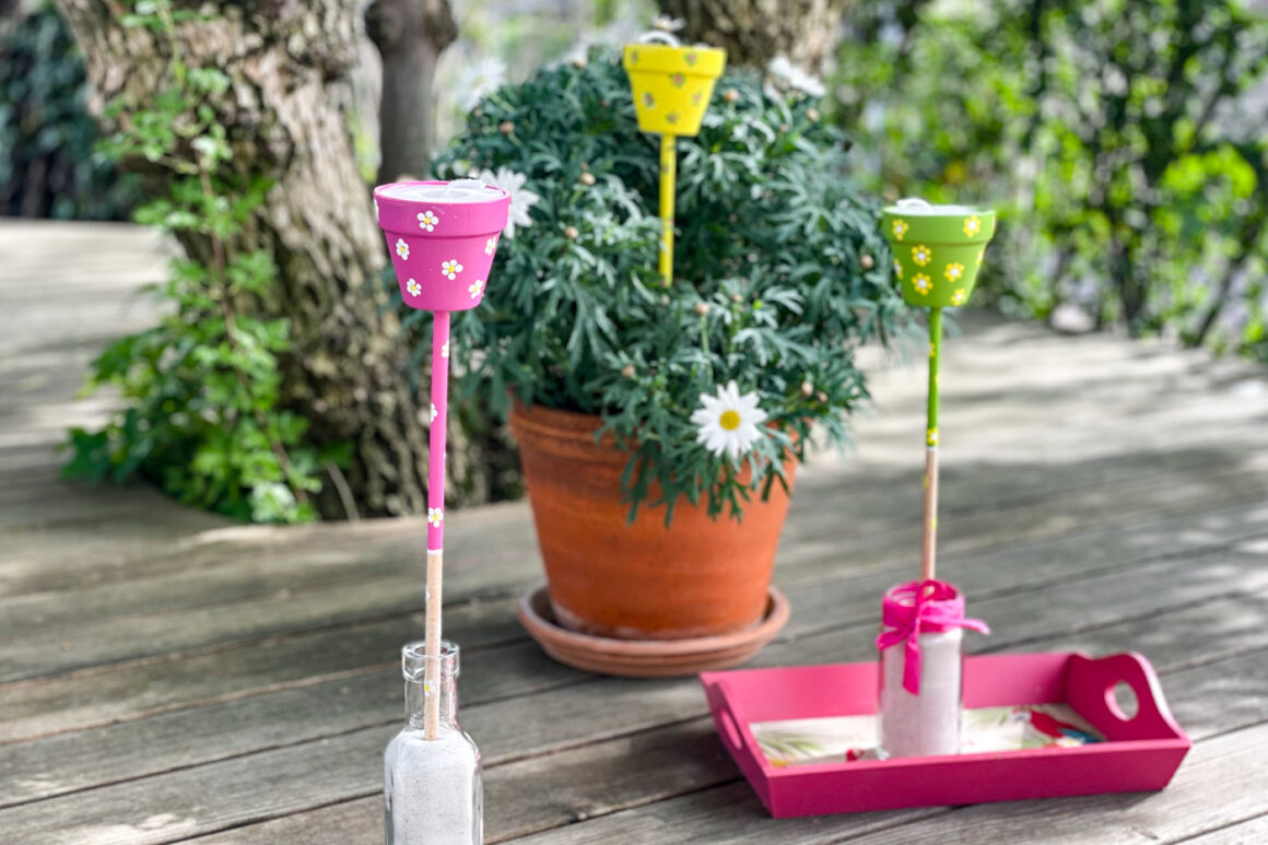 Die bunt bemalten Mini-Fackeln werden in Blumentöpfe oder auch leere Flaschen gesteckt und sind nebst kuschligem Feeling und dem praktischem Fakt, dass sie auch ein Mücken- und Wespenschreck sind, auch noch ein optisches Deko-Highlight für den Sommertisch oder Gartensitzplatz.