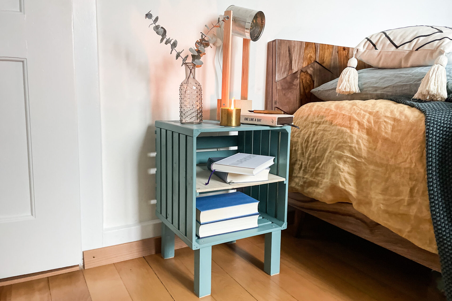 Wir haben für unseren Nachttisch einen Holzharass umgestaltet, ihm Beine sowie einen Zwischenboden verpasst und in unserer Lieblingsfarbe gestrichen. Er dienst als nützliche Ablagefläche für Bücher oder Deko und hat dennoch genügend Platz für eine Leselampe.