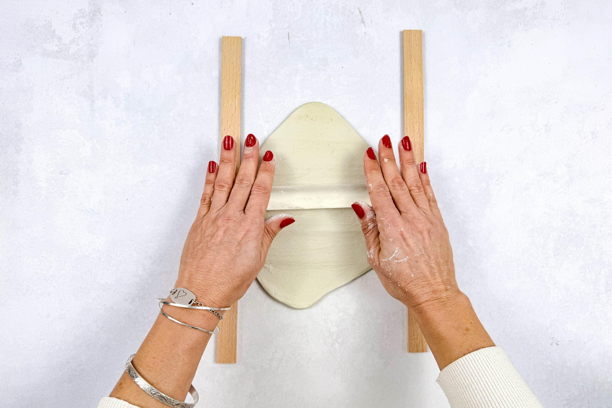 3. Die Modelliermasse zwischen zwei 5mm hohen Teighölzern platzieren und mit dem Acryl-Roller gleichmässig auswallen.