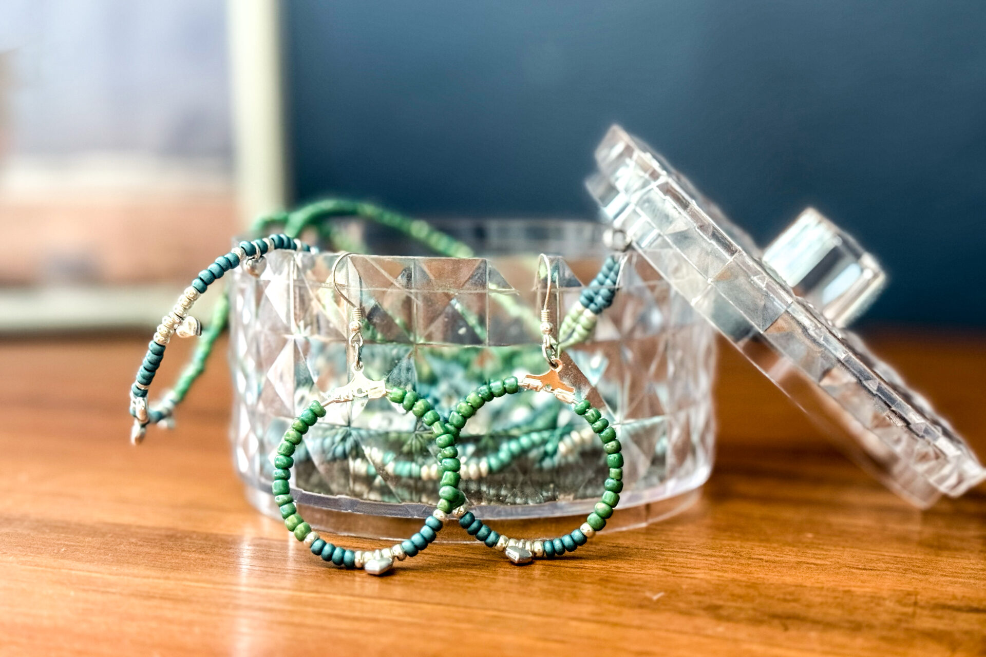 Bei der Gestaltung seid ihr völlig frei, ob ihr zarte Rocailles (Glasperlen) wählt, mit kleinen Anhängern Akzente setzt oder Buchstabenperlen oder Quasten integriert: tut was euch gefällt. Achtet lediglich darauf, dass eure Farben harmonieren. Ist natürlich auch Geschmackssache, manche mögen ein buntes Sammelsurium, andere wiederum – zB. WIR- bevorzugen mehr so die klare Farbpalette. Wir haben uns für Blau- und Grüntöne entschiedene, die wir mit silbernen Details kombiniert haben. Daraus entstanden eine Halskette mit passenden Kreolen und Armbänder.