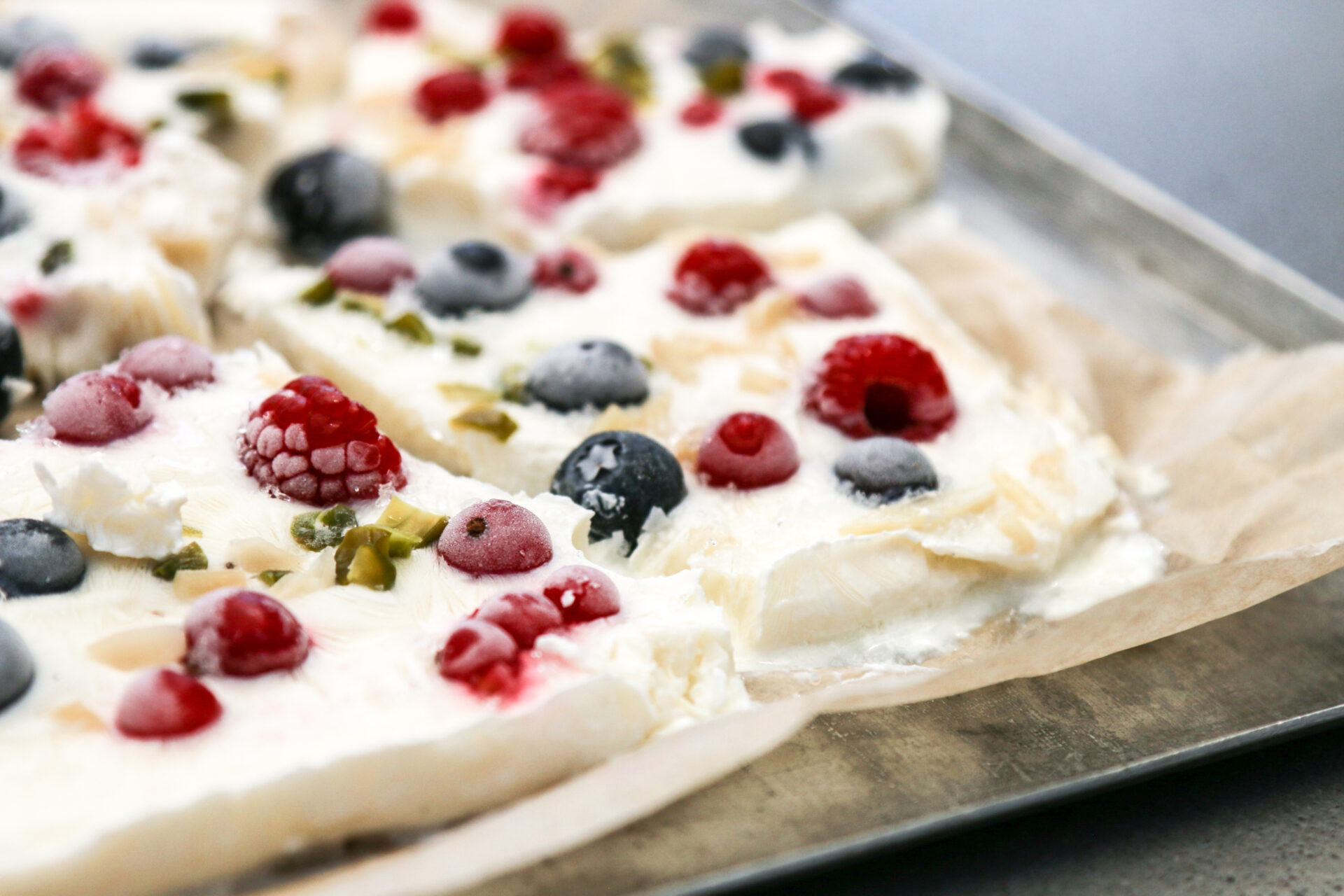 - Eine Brownieform (muss im TK Platz haben) mit Backpapier oder Frischhaltefolie auslegen und Joghurtmasse darauf verstreichen. Beeren, Mandeln und Pistazien darauf verteilen und das Blech für mindestens 6 Stunden ins Tiefkühlfach legen.