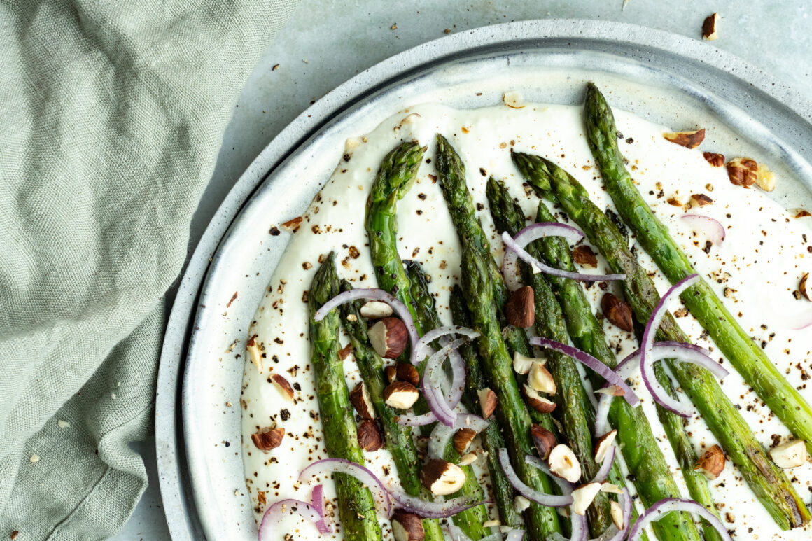 - Feta-Crème auf einem Teller verstreichen, Spargel darauf betten, mit gerösteten Haselnüssen und Zwiebelringen toppen. Wer mag, gibt noch etwas Zitronenzeste oder einen Hauch Chiliöl drüber.