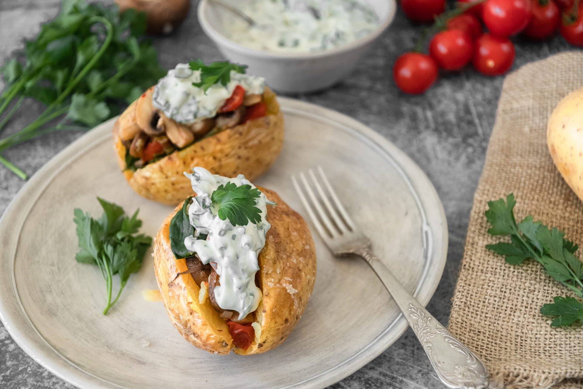 Gefüllte Kartoffeln // Baked Potatoes mit Tomaten-Pilz-Spinat-Füllung