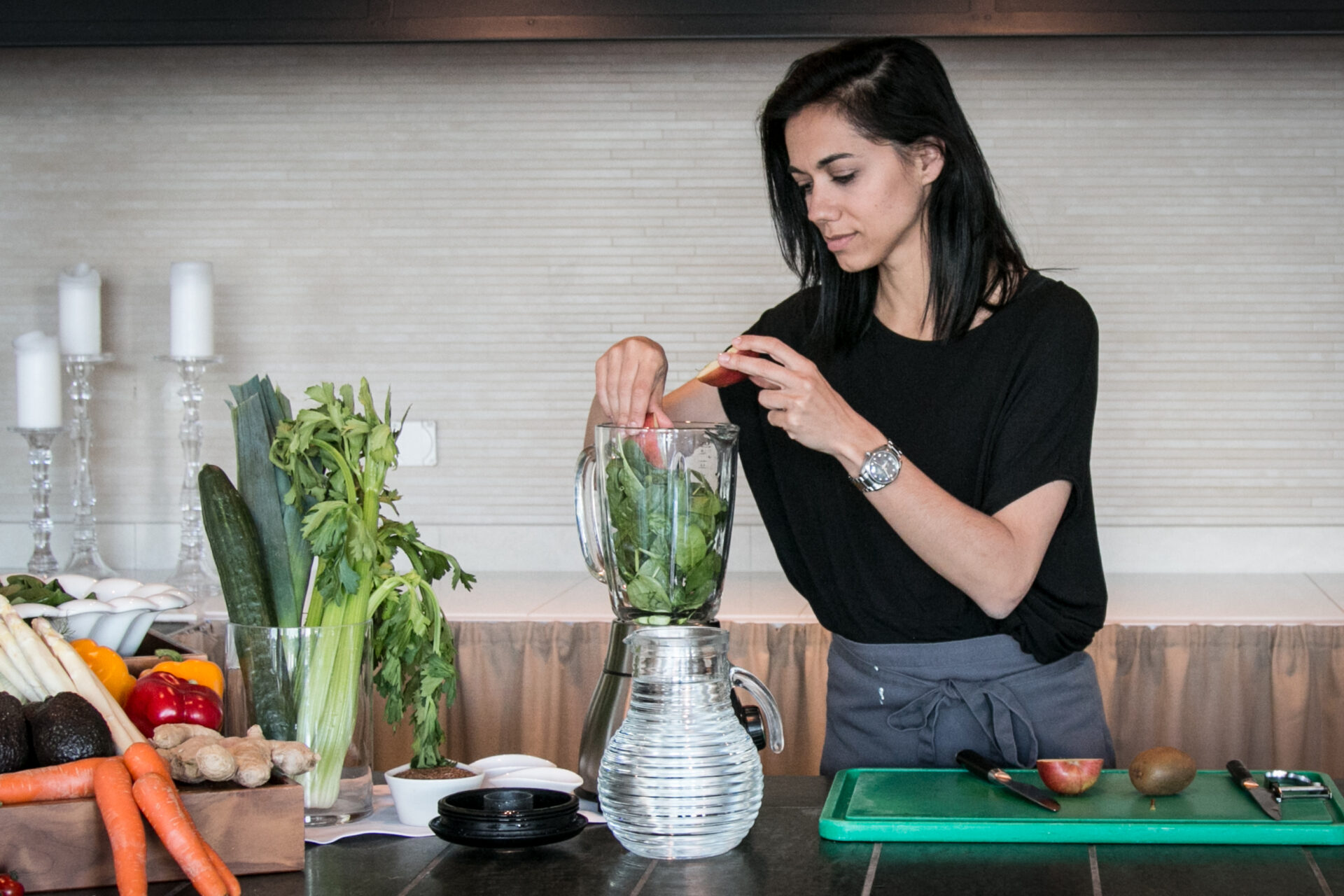 Nach dem Workshop haben wir unsere grasgrünen Smoothies beim Pool unten dann noch hübsch für ein paar Fotos in Szene gesetzt. Das war relativ einfach, denn irgendwie sah hier automatisch alles hübscher aus, als wenn ich bei mir in der dunklen, unfreundlichen und klitzekleinen Küche mit Hintergründen, Tüchern, Licht und Holzplatten improvisiere.