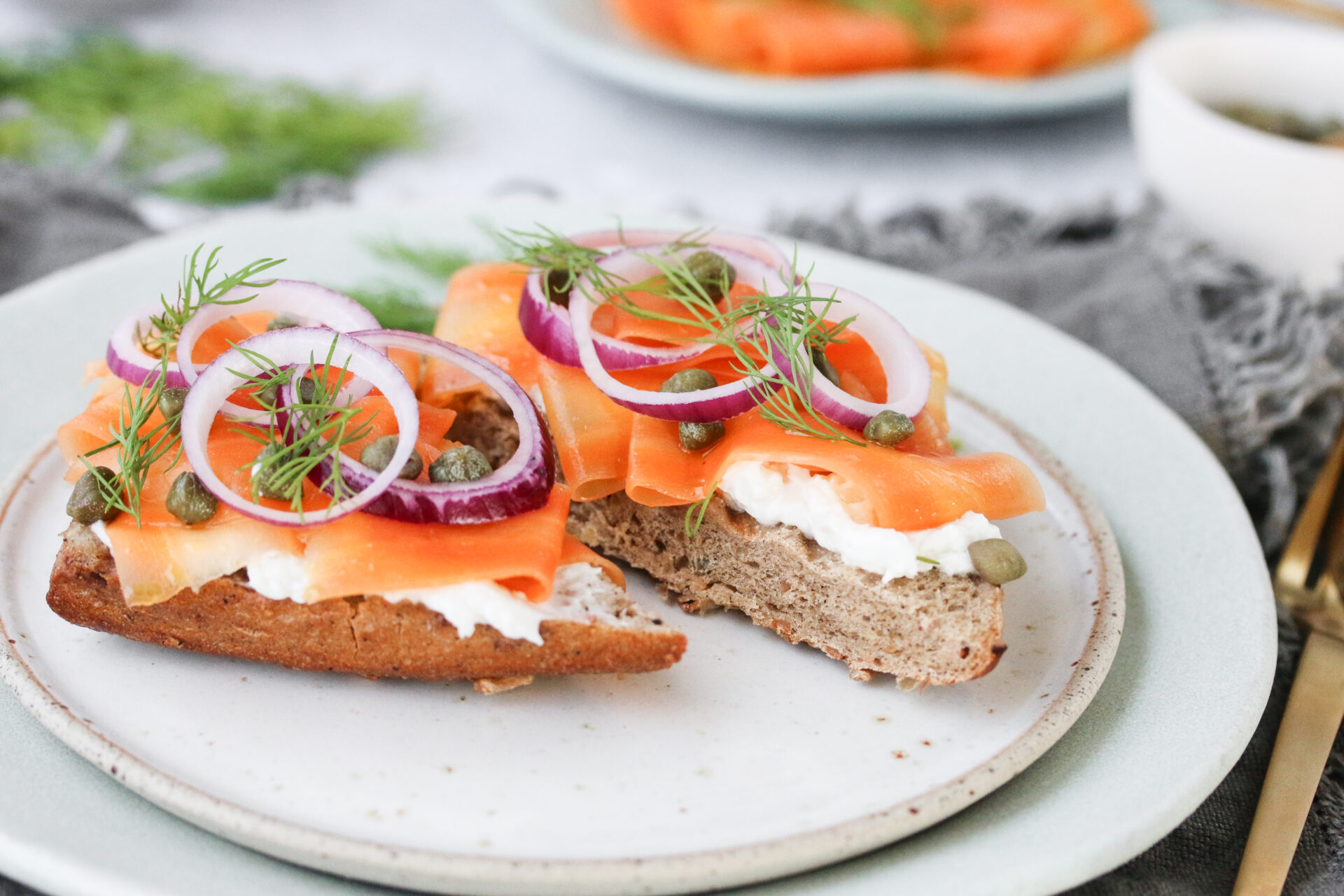 - Den Karotten-Lachs mit Bagels oder Toast und Frischkäse/Meerrettich servieren. Dazu passen Kapern, Dill und Zwiebelringe. Wer den extra fischigen Geschmack mag, gibt noch etwas der beiseite gestellten Nori-Paste auf den Lachs.