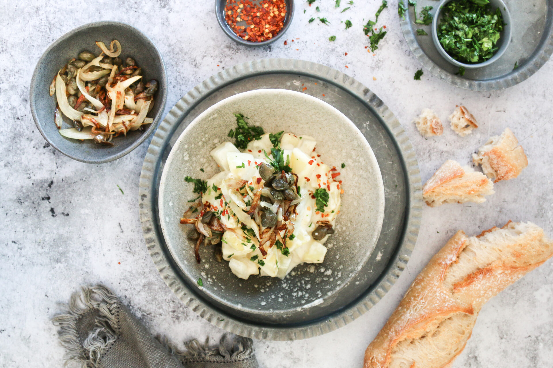 Der tolle Eintopf ist schnell gemacht. Inklusive Schnippeln und köcheln. Etwa 15 Minuten reichen bei letzteren, so dass der Kohlrabi noch bissfest ist (die Kartoffeln müssen natürlich durch sein). Und mein Higlight sind die gebratenen Zwiebeln. Mit den Kapern kommt da etwas Säure rein, wer das aber nicht mag, kann sie einfach weglassen.