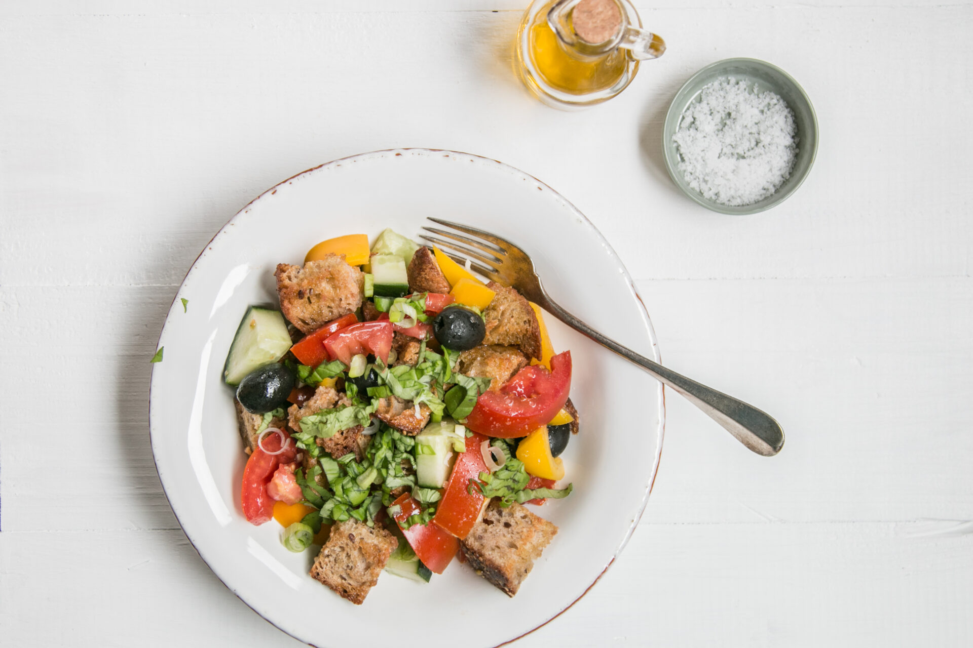 Dieser Salat stammt aus Italien – wie der Name schon vermuten lässt. In der Toscana heimisch, war er usprünglich ein Arme-Leute-Essen. Man bediente sich auf dem Feld, nahm, was da war und konnte auf diese wunderbare Weise altes Brot weiterverwerten. Das Brot saugt den Saft der reifen Tomaten und das Olivenöl auf und mehr muss ich dazu wohl nicht mehr sagen. Allein die Vorstellung lässt einem das Wasser im Mund zusammenlaufen.