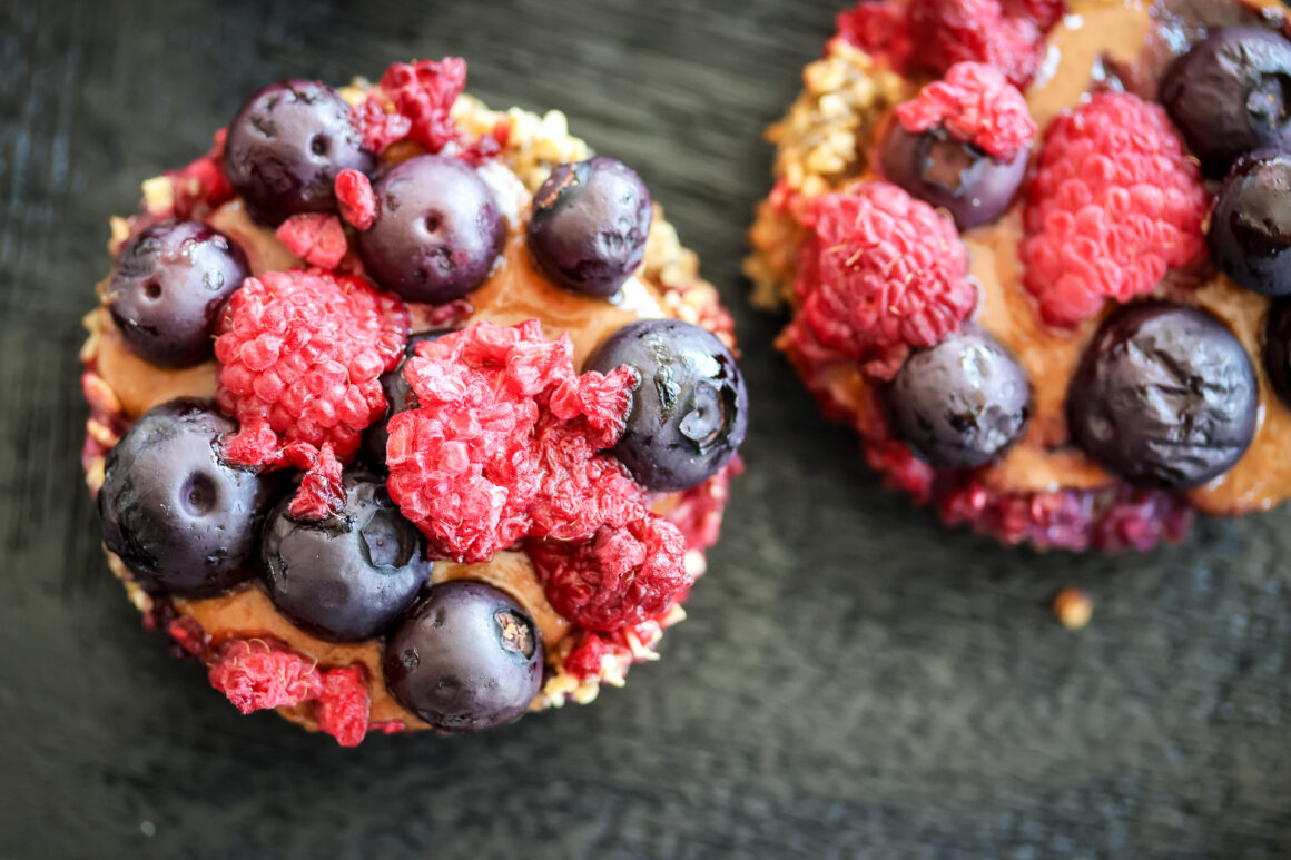 - Erster Backgang: ca. 15 Minuten vorbacken, bis die Masse leicht fest wird. Herausnehmen und noch warm mit Mandelmus bestreichen. Gefrorene Beeren darauf verteilen.