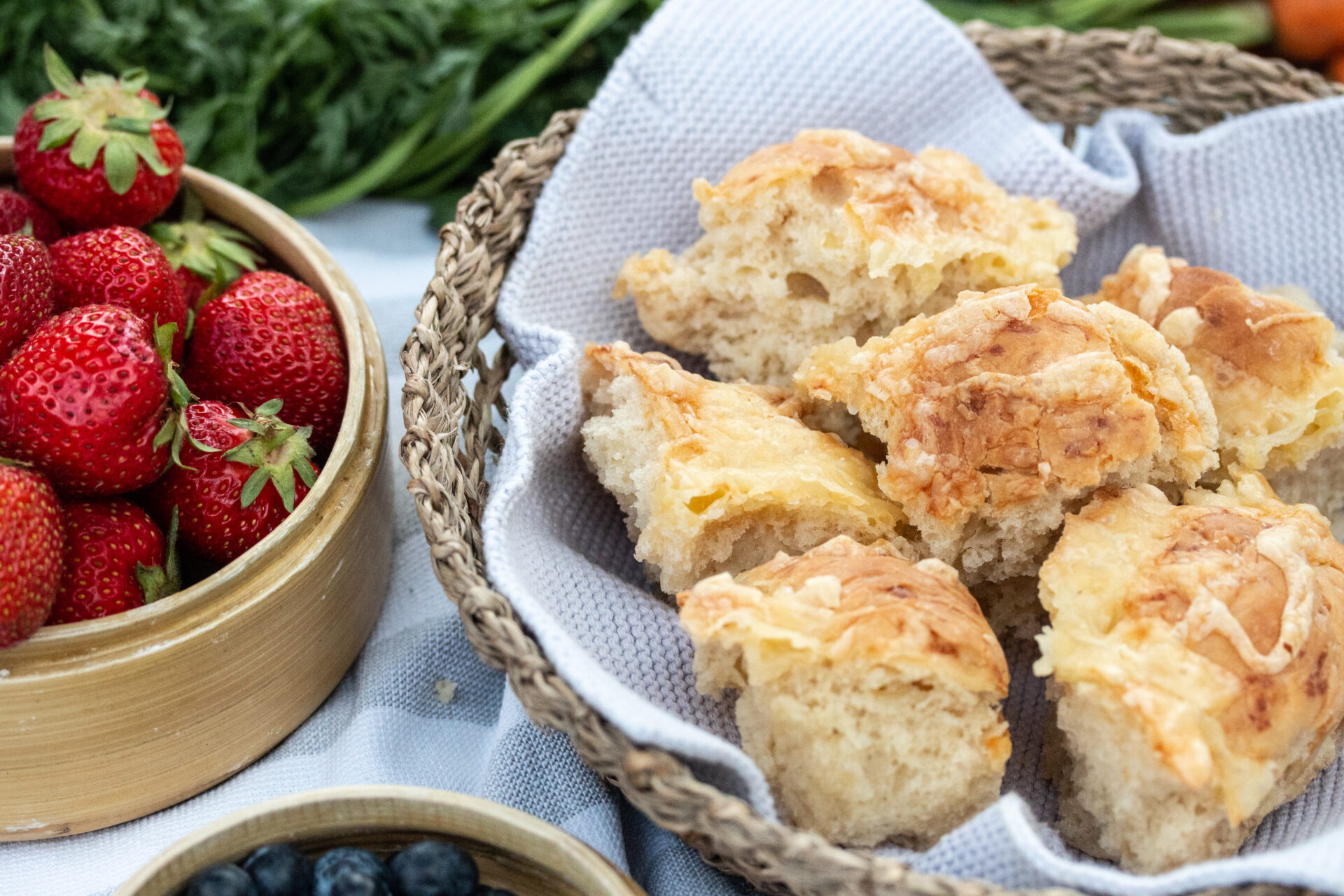 Also eigentlich ist es ein Brot. Aber als Bällchen gebacken. Und so kann man sich mundgerechte kleine Brötchen abreissen. Toll für ein Picknick.