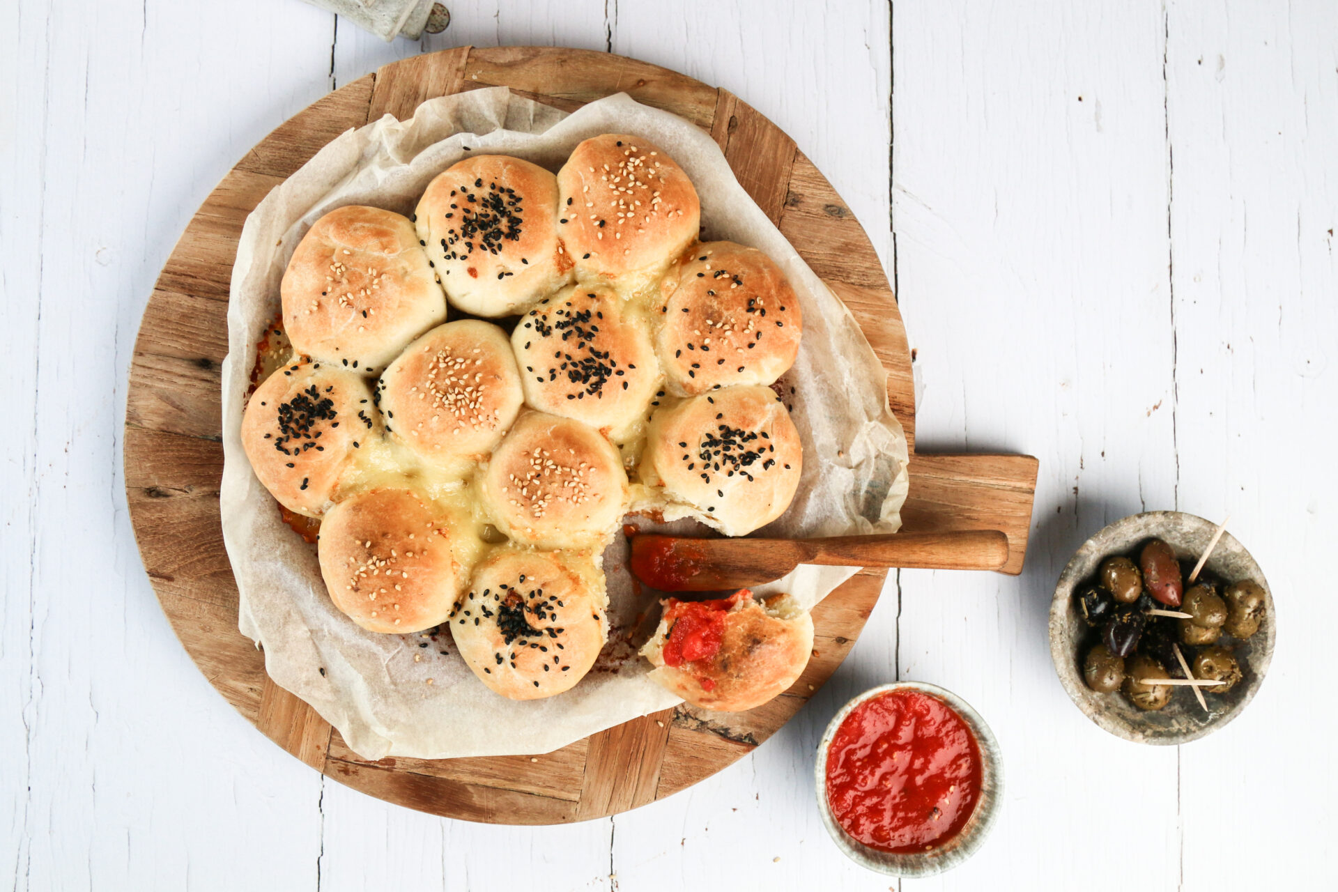 Raclette-Pizzaball mit Tomaten-Apfeldip
