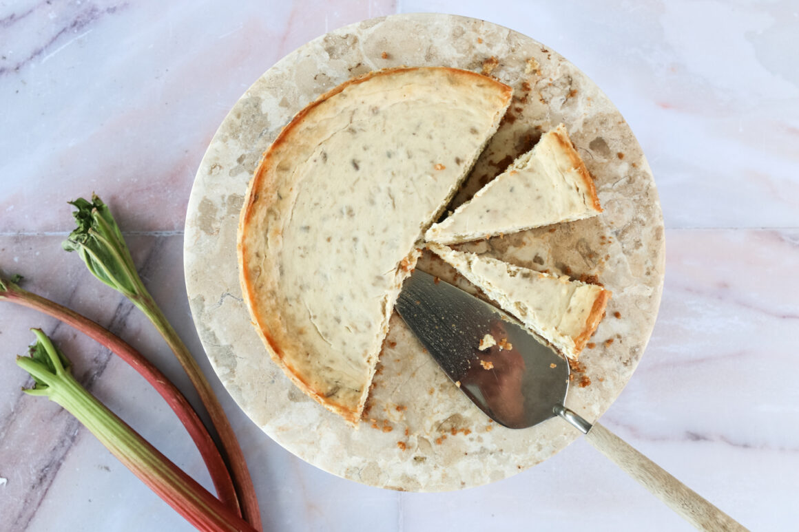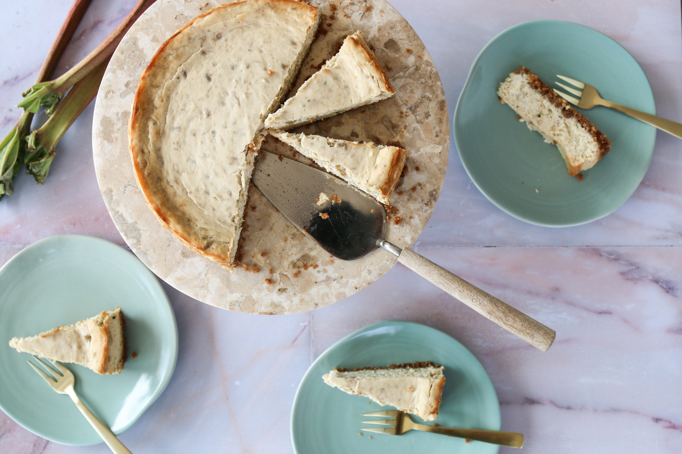 Seine Säuerlichkeit ist prickelnd und aufregend und so gibt der Rhabarber herzhaften Speisen einen spannenden Twist und jeglichem Gebäck sowieso. Im Cheesecake trifft er auf zahmen, cremigen Frischkäse, was super passt und den Cheesecake ein Tick erfrischender macht, als er eigentlich wäre und wunderbar mit ihm harmoniert.