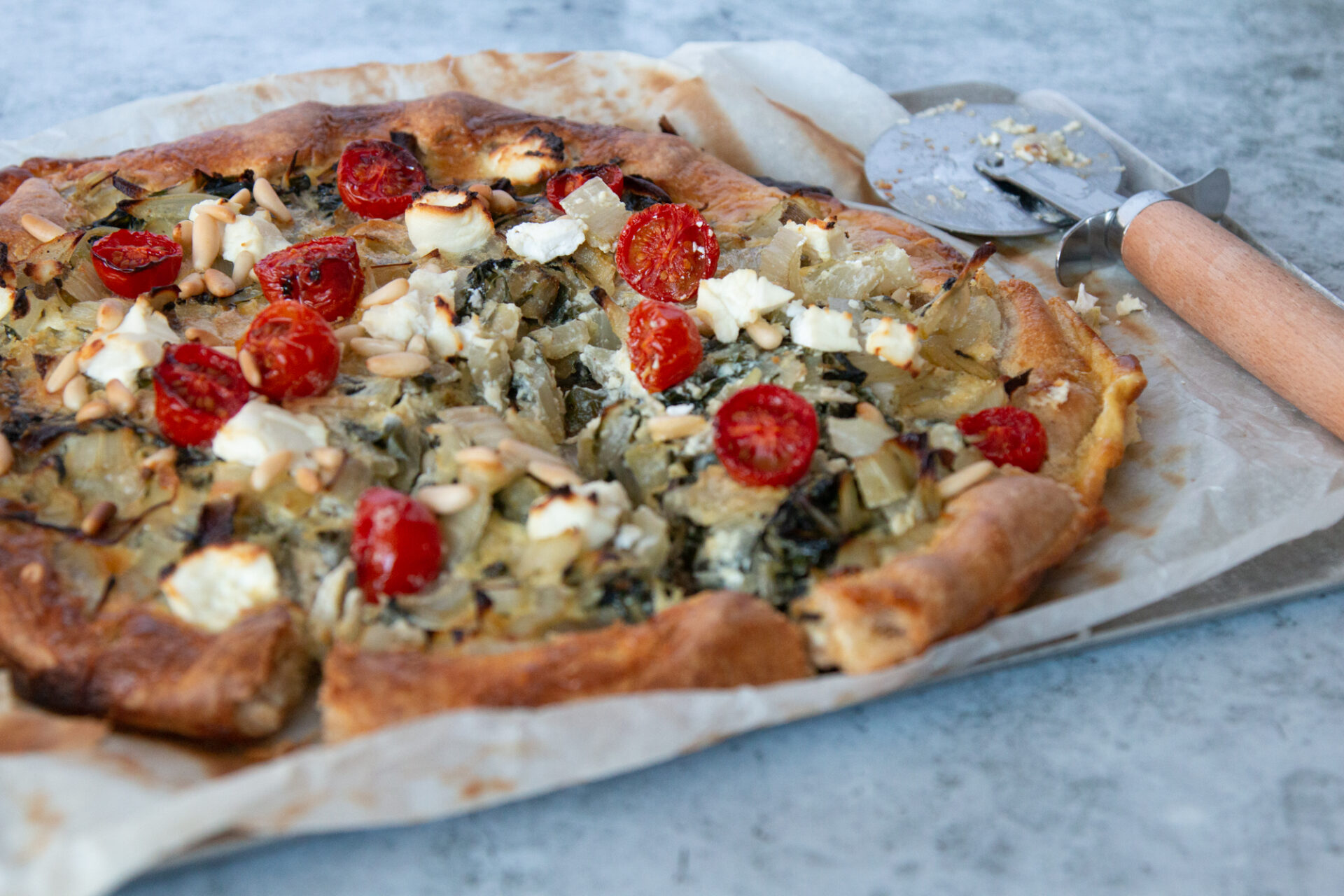 Der erdige Kraustiel und die grob geschnittenen Zwiebeln geben der Tarte gleich noch einen Hauch Rustikalität mehr. Und die mitverwendeten weissen Stiele des Kraustiels, machen die Tarte schön saftig. Die Zitrone wiederum zaubert etwas Frische hinein. In Kombination mit den Tomaten, den Pinien und dem Ziegenfrischkäse schmeckt diese Tarte himmlisch.