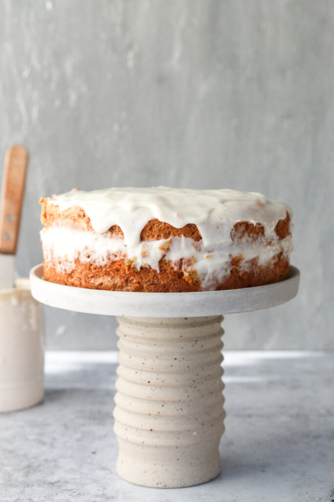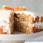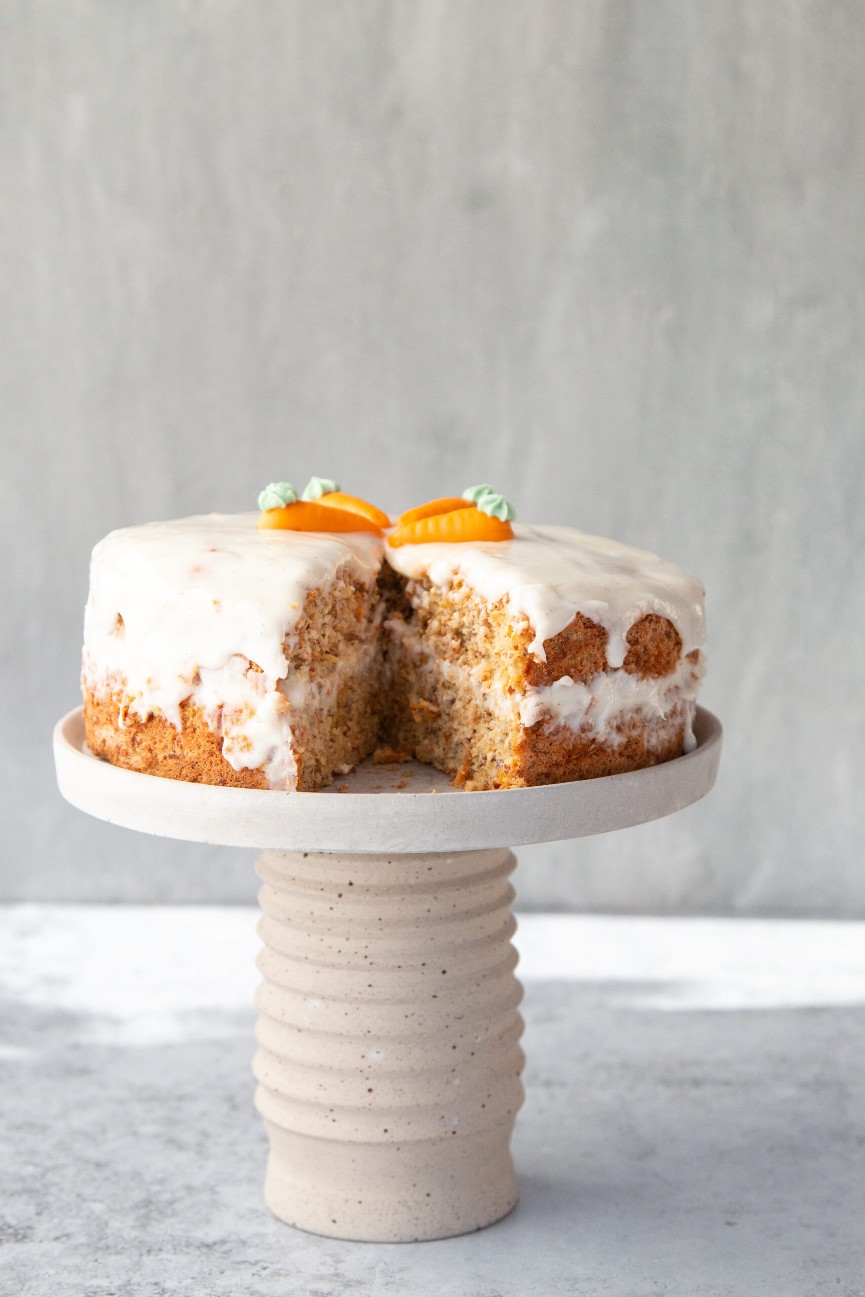 - Den Kuchen mittig der Länge nach durchtrennen.Die Hälfte des Frostings auf die untere Hälfte des Kuchens streichen und die obere Hälfte wieder aufsetzen. Das restliche Frosting auf dem Kuchen verteilen und die Marzipankarotten darauf drapieren.
