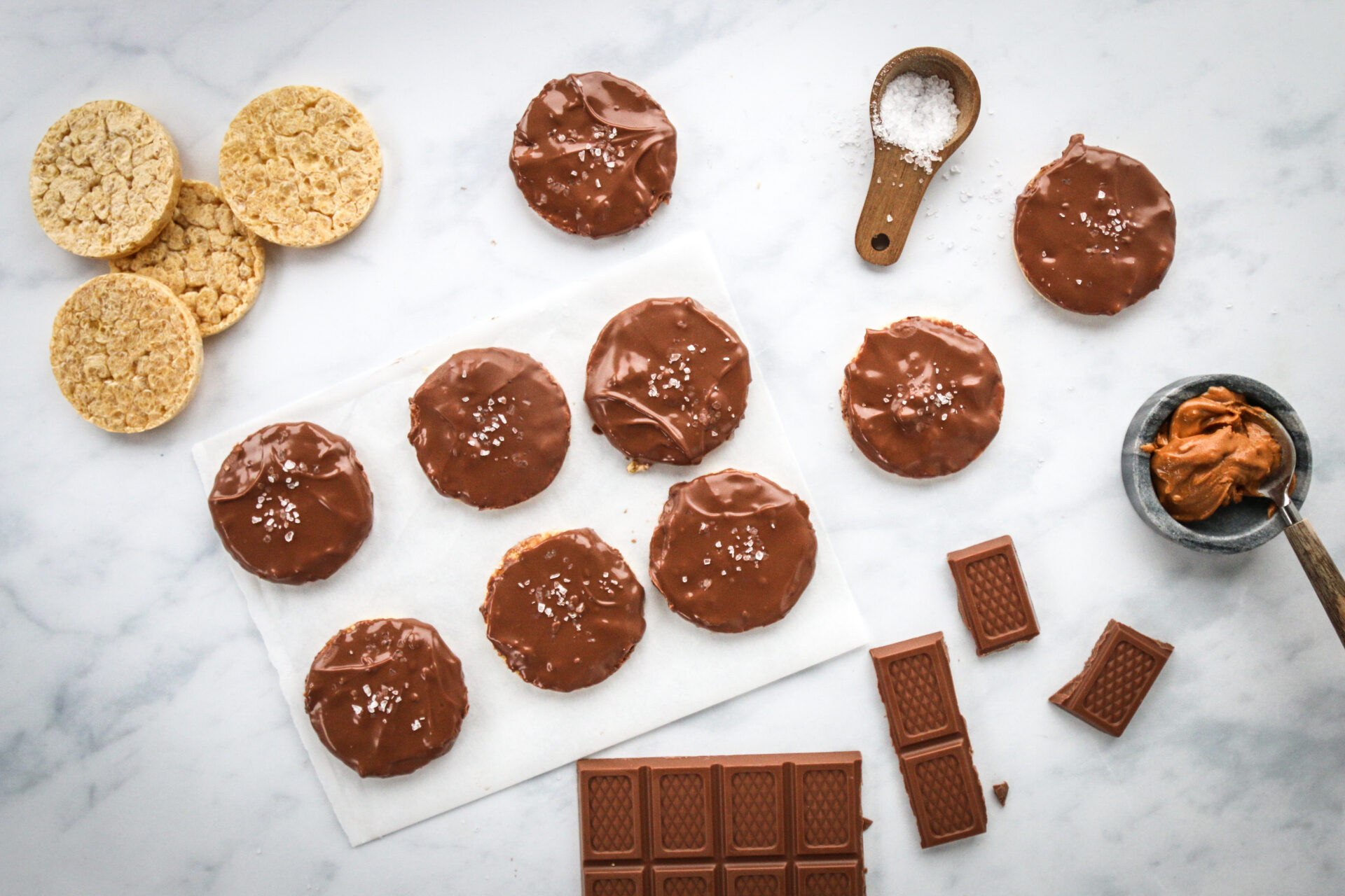 - Linsenwaffeln grosszügig mit Erdnussbutter bestreichen. Wenn diese stark flüssig ist, die bestrichenen Waffeln eine halbe Stunde im Kühlschrank kühlen. Ansonsten direkt weiterfahren und die bestrichene Hälfte in die Schokolade tauchen. Mit Salzflocken bestreuen und kalt stellen, bis die Schokolade fest ist. (Idealerweise im Kühlschrank lagern, so dass die Schokolade schön knackig bleibt.)