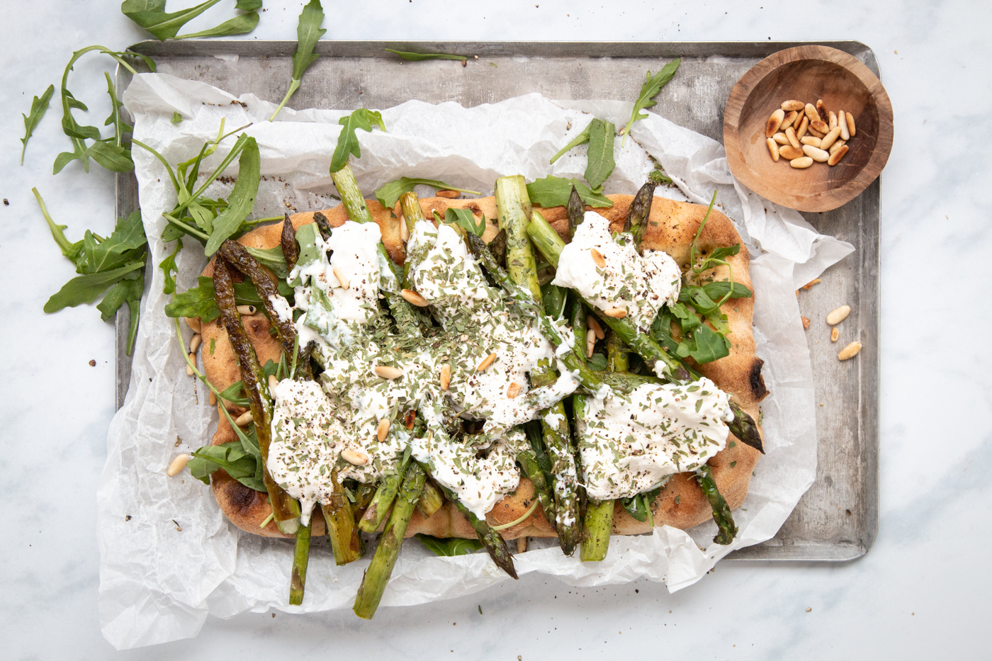 - Pinsateig mit Olivenöl beträufeln, mit Burrata bestreichen, mit Rucola und Spargeln belegen und mit Estragon und Pfeffer würzen (oder Burrata ab Schluss darüber verteilen).