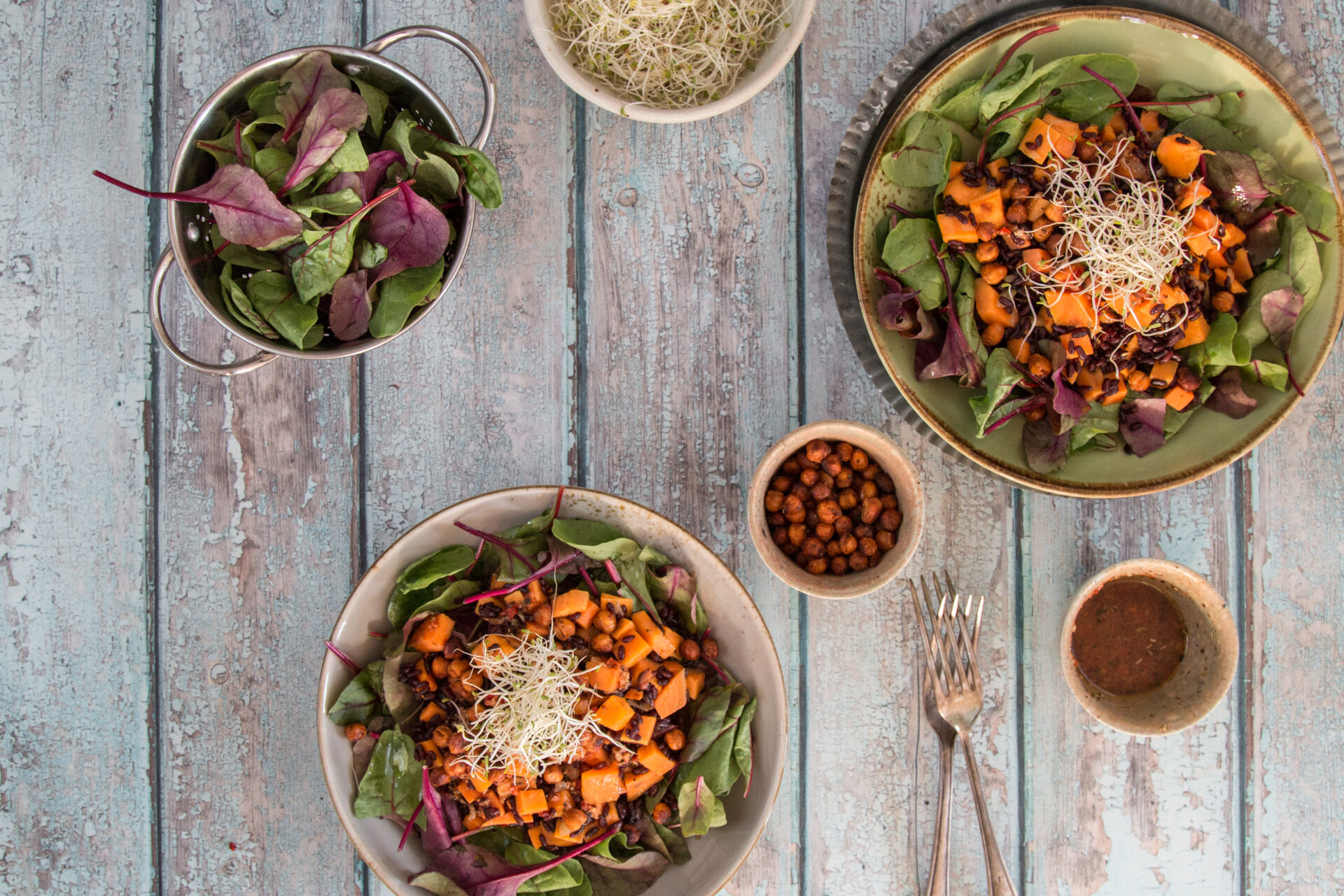 Dieser Salat beinhaltet unüblicherweise 3 stärkelastige Lebensmittel: Schwarzer Wildreis, Süsskartoffeln und Kichererbsen. Ein Tabubruch eigentlich, doch mittlerweile in der traditionellen westlichen Küche ein Trend und in vielen anderen Kulturen sowieso völlig normal.