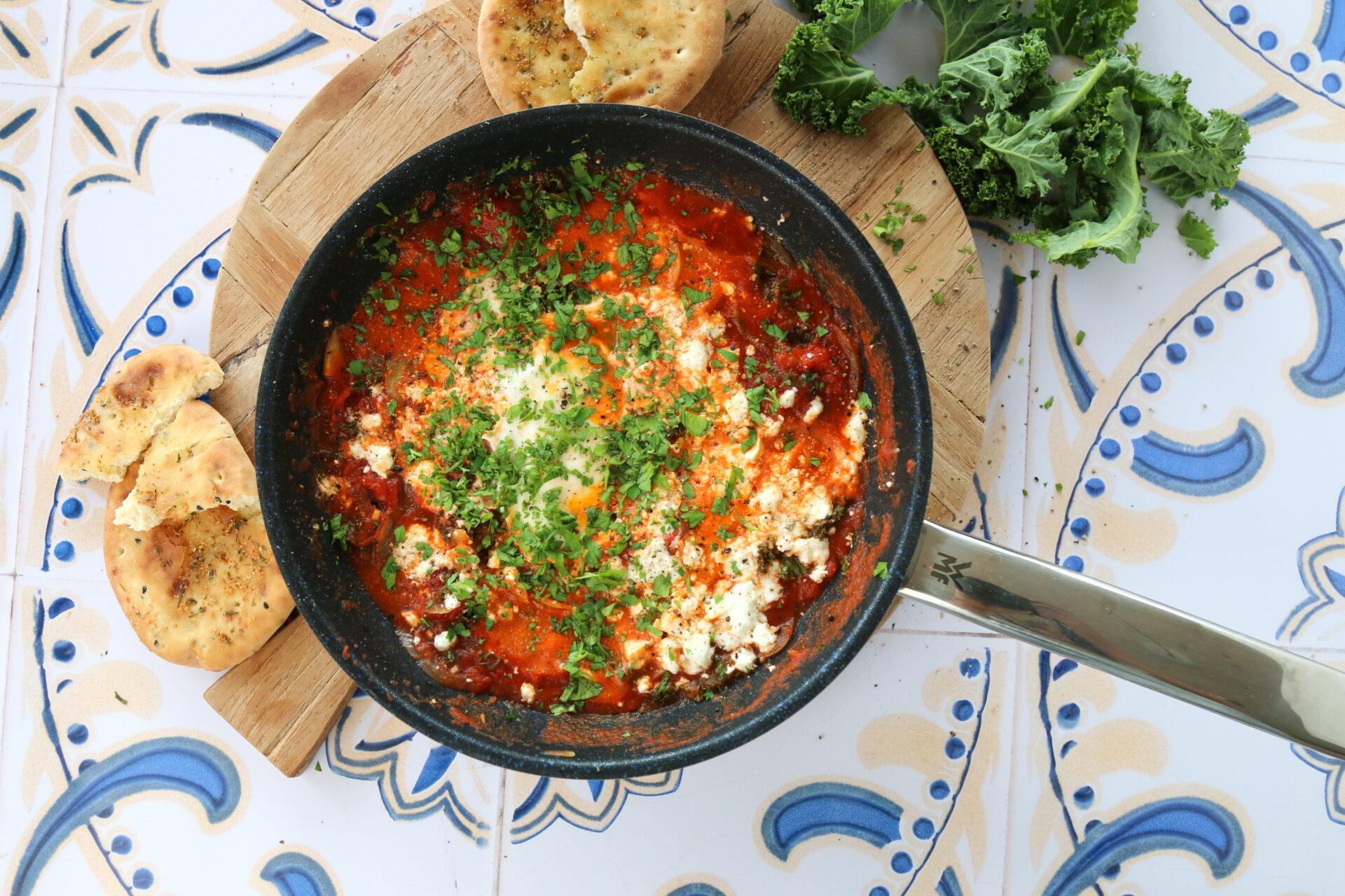 - Shakshuka in der Pfanne servieren, Petersilie und grober Pfeffer darüber streuen. Mit Fladenbrot aus der Pfanne dippen.